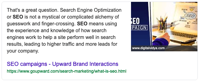 It contains a brief 'snippet' of information that Google believes either answers the user's question or provides enough value to entice them to click and learn more.