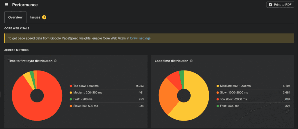 This will take you to the Performance report that contains your Core Web Vitals metrics (if they’re enabled), Ahrefs speed metrics, and your load time distribution.