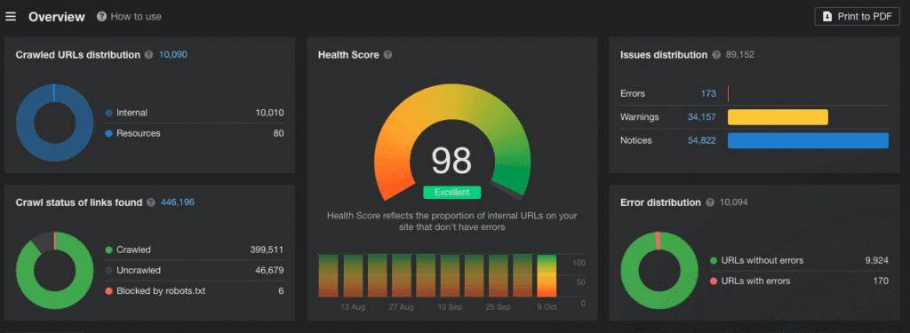 If you’ve got a subscription to Ahrefs, you’ll be able to check your site speed using its Site Audit tool. You can even enable official Google Core Web Vitals metrics to show up in the tool, which you need to do in the Crawl settings. First, you’ll have to get an API code from Google (the link is in Ahrefs) that will enable Core Web Vitals (and Lighthouse) data to appear in Ahrefs.