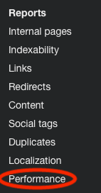 Here, you get to see your crawl results and an overall health score for your website. However, we want to check site speed, so navigate to Performance under Reports on the left-hand sidebar: