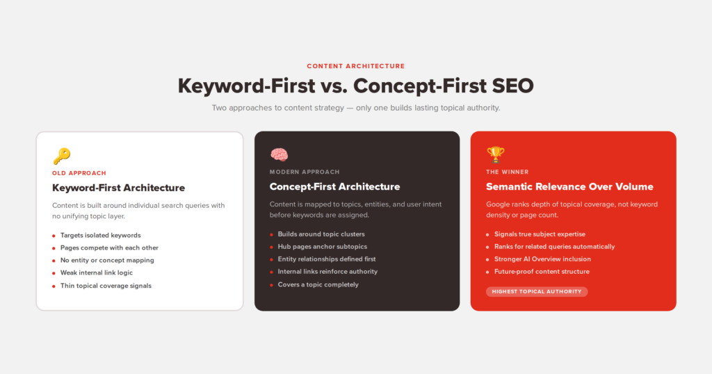 The distinction matters because Google’s algorithm has been evaluating content semantically since the Hummingbird update in 2013, and every major algorithm development since, from RankBrain to BERT to MUM, has pushed further in the same direction. Google doesn’t match your page to a query by checking whether it contains certain words. It evaluates whether your page genuinely represents a concept and whether your domain is an authoritative source on the broader topic that concept belongs to.