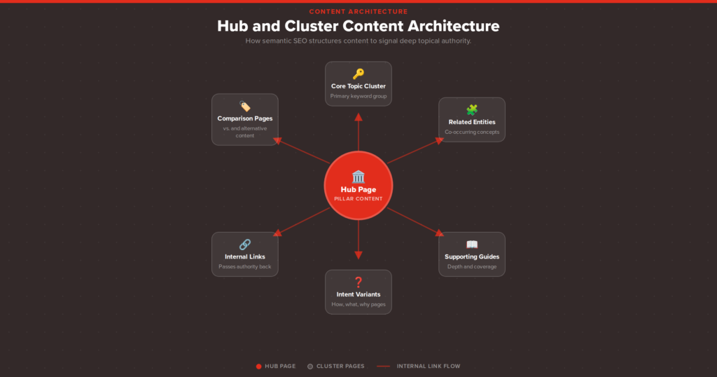 Semantic SEO builds content around concepts. Each concept has a central hub page that covers the topic comprehensively and a surrounding cluster of supporting pages that explore subtopics, answer related questions, and cover the concept from multiple angles. Every page in the cluster reinforces the hub, and the hub reinforces the cluster. The internal link structure mirrors the conceptual relationships between the topics.