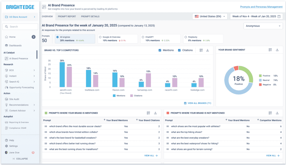 AI search is still very new, so there aren’t many reliable tools out there for analyzing its impact on revenue and lead generation. Currently, you track your visibility in Google’s AI Overviews using tools from Ahrefs, Semrush, and Keyword.com. To monitor your brand’s presence on LLM-powered platforms like ChatGPT and Perplexity, BrightEdge recently released its AI Catalyst, a dashboard that centralizes AI search visibility. Here’s a peek at what it looks like: