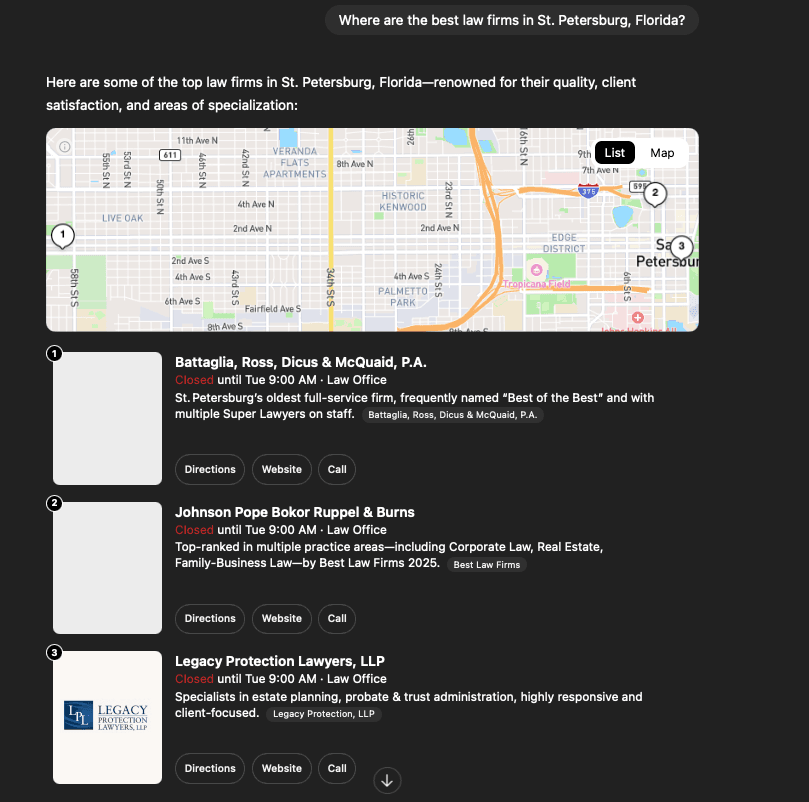 Instead, ChatGPT checked legal review sites, law firm websites, and reputable local directories to compile its own list of recommendations.