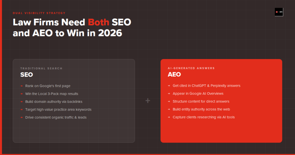 AEO is the practice of optimizing your content to appear in AI-generated answers — not just traditional search results. For law firms, this means: