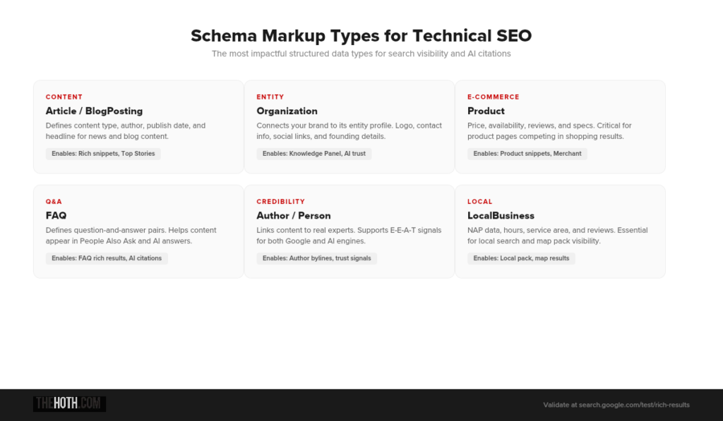 That means your entity profile matters. Are you mentioned across authoritative third-party sources? Do you have consistent NAP (name, address, phone) data across the web? Is your organization schema properly implemented?