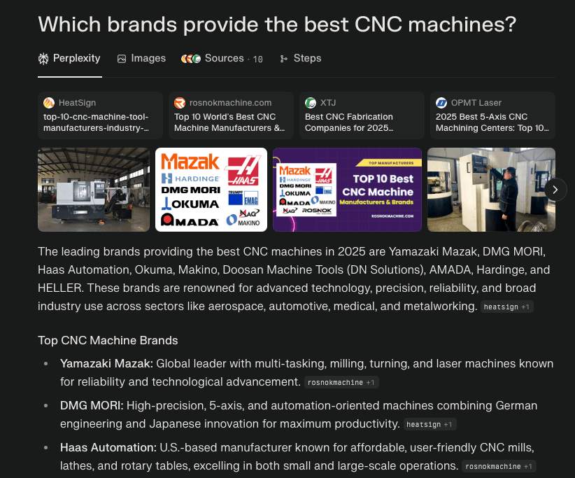 Here’s an example of what we mean. Let’s ask Perplexity which brands provide the best CNC machines. From a marketing perspective, we’re a highly qualified prospect for CNC machine providers. Here’s the response: