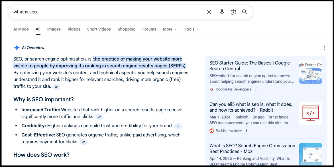 Many websites have seen sharp declines in organic traffic lately, which has caused some marketers to declare that SEO is no longer effective. In late 2024, a study by Rand Fishkin discovered that 60% of searches were zero-click searches, meaning users didn’t click on any organic results. Why is that? The main reason is the prevalence of Featured Snippets and AI Overviews. As an example, imagine that you wanted to learn the definition of SEO after hearing a coworker mention it in passing. You don’t have a website or need SEO services, you’re just really curious about what the term means. To find out more, you type ‘what is SEO’ into Google. Here’s what you’ll see: