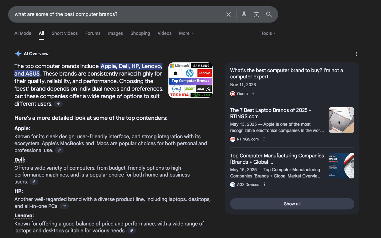 For this query, Google’s AI recommends what it believes to be the highest quality computer brands.