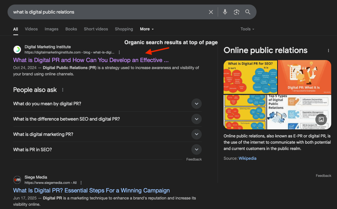 Here, the organic search results appear at the very top of the page. There are a few SERP features like the People Also Ask section and Knowledge Bar, but the organic results are very much the star of the show.