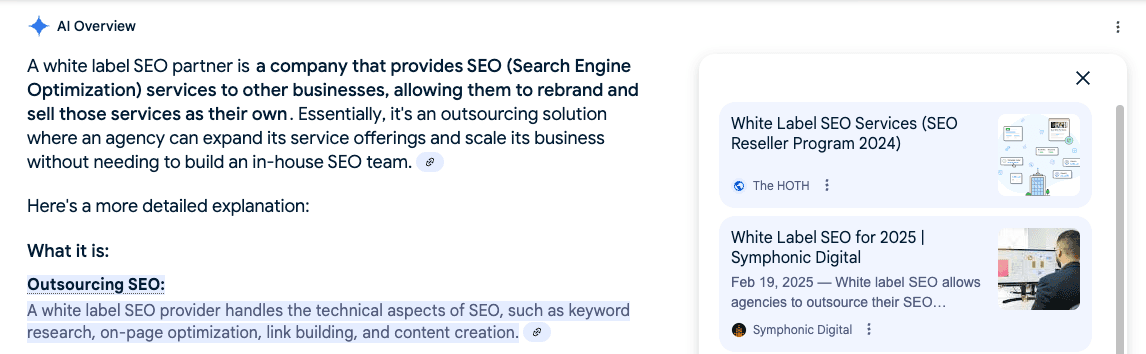According to the report, one of our web pages should pop up in the AI Overview for the keyword ‘white label SEO partner’: