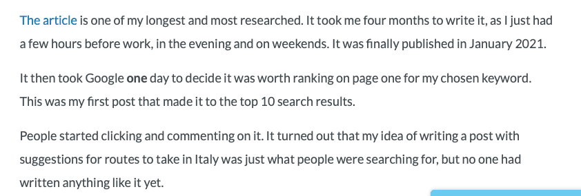 Want to see how effective using topical authority and E-E-A-T together can be for your SEO? Let’s take a look at how Moz’s SEO consultant Dani Leitner used both to catapult her modest travel blog to the top of Google’s search results.