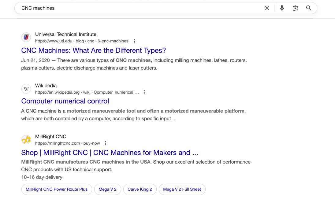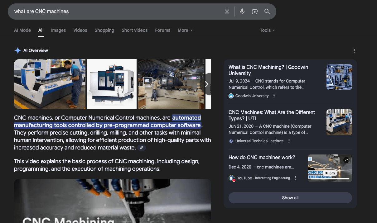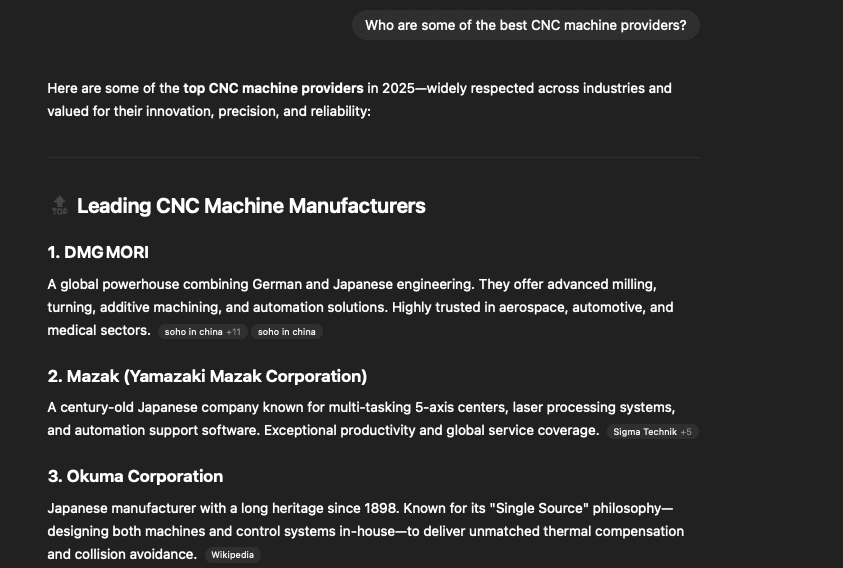 Next, you should manually test popular prompts in your niche. Not only will this let you know if your brand is getting mentioned or not, but it’ll help you create a competitor benchmark. In other words, you’ll get to see all the prompts that your competitors are getting cited for, but you aren’t. As an example, here’s a prompt you should look up if you provide CNC machines: