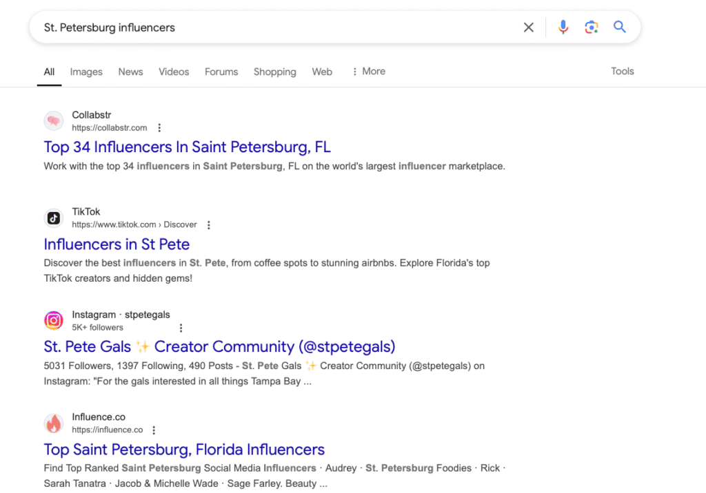 As stated previously, over half of marketers report that working with influencers yields better results than their self-promotional efforts. In today’s age, customers from just about every industry listen to influencers. Just how much influence do they have? According to research, a whopping 87% of customers report they’ve been swayed by influencers when purchasing new products. You don’t have to target mega influencers on the level of the Paul brothers, either. There are plenty of influencers in every niche under the sun, and they don’t need millions of followers to generate impressive results. For instance, nano influencers only have around 1,000 - 5,000 followers, but they’re extremely tight with their audience. That means their followers are highly likely to go with the products they recommended. The same is true for micro influencers, who average anywhere from 5,000 - 30,000 followers. These influencers are often seen as niche experts and thought leaders, so they’re extremely valuable partners to have. How do you find relevant influencers? You can use Google’s search operators to find influencers in specific cities and industries. Typing in something like “city name + influencers” into Google will provide you with some prospects to vet. Here’s what happens when we search for “St. Petersburg influencers” on Google: