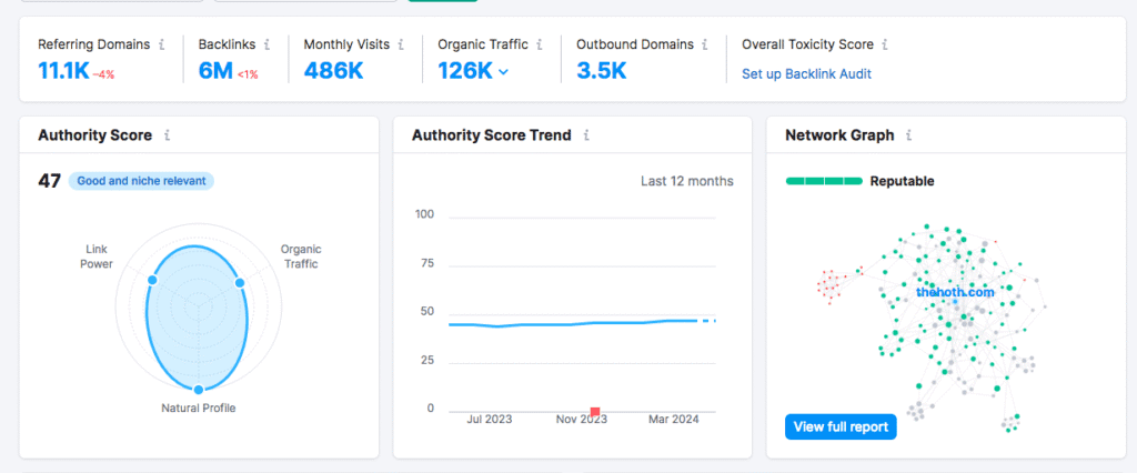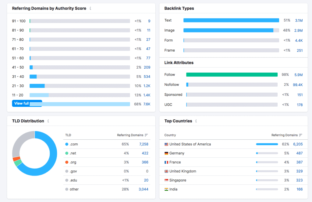 It’s crucial to keep an eye on your website’s backlink profile, as it’s subject to change quite often. Try to check it at least once per week, especially if you’re actively trying to build more links. The Backlinks Analytics Report is what you want to use to check on your link profile, including any new developments.
