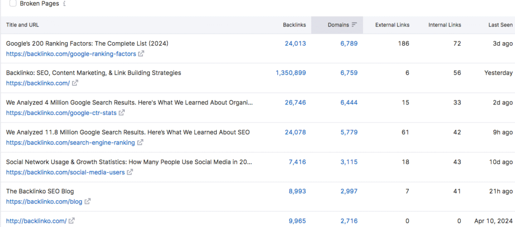 One of the best ways to build links without going nuts conducting outreach is to create outstanding content that naturally attracts links from other websites. Yet, that’s often easier said than done, as it can be tricky to know which type of content to create. Semrush’s Indexed Pages report is your secret weapon for uncovering content ideas that generate links. This time, you’ll want to enter a competitor’s URL into the tool instead of your own. Once that’s done, navigate to the Indexed Pages report to see the web pages that have generated the most backlinks for them. From there, take notes on which content types attracted the most links, and then create similar content for your brand.
