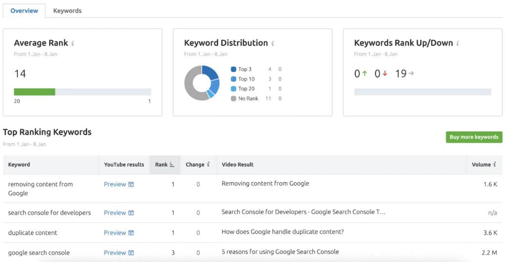 - A pie chart representing keyword distribution for ‘top 3,’ ‘top 10,’ and ‘top 20’ rankings