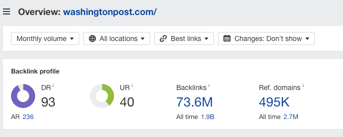 As you can see here, it has a Domain Rating (DR) of 93, with the highest possible score being 100. That’s some serious authority! Besides that, the domain sees millions of organic visitors each month, giving you plenty of chances to pick up referral traffic from your link.