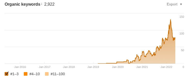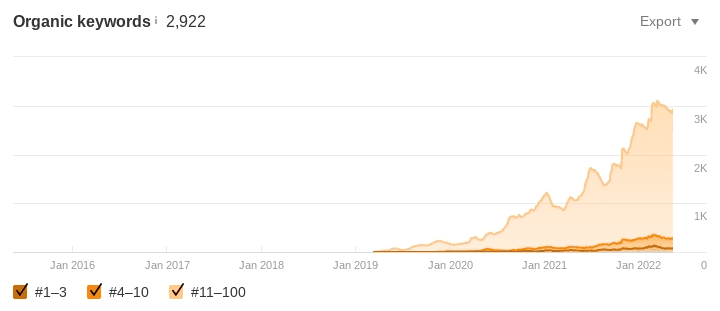 Their number of ranking keywords grew from 380 to 2,922 today. You can see their growth in keywords ranking in positions 4-10 and 11-100.