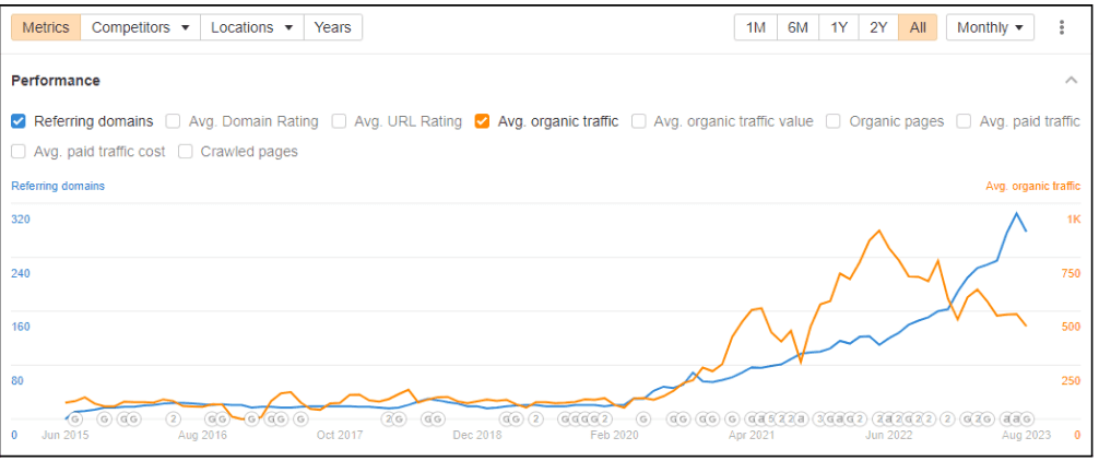 Before we began handling their SEO, they were receiving next to no organic visitors or backlinks. That all changed as soon as we began creating content and building links for their domain.