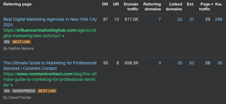 DR stands for Domain Rating, and it represents the ‘ranking strength’ of a domain. As you can see, these two links we built for the client (among many others) have extremely high DR scores of 87 and 93 (100 is the highest).