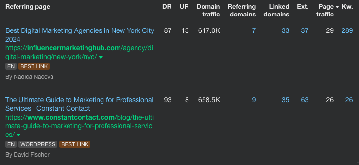 DR stands for Domain Rating, and it represents the ‘ranking strength’ of a domain. As you can see, these two links we built for the client (among many others) have extremely high DR scores of 87 and 93 (100 is the highest).