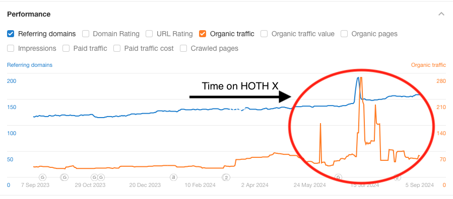 We quickly realized the problem (thanks to the client’s existing knowledge of SEO), and signed the client up for a HOTH X campaign.