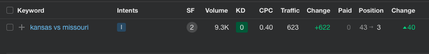 When we started our strategy, the client ranked for the keyword ‘kansas vs. missouri’ in position 43.