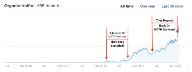 Here’s the problem. Six months passed and the client started to get antsy for big results. They canceled HOTH X in the fall of 2018 – right before their traffic finally took off!