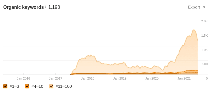 The same went for their ranking keywords. When the campaign started they ranked for about 200 keywords, which had been pretty steady for years. Below you can see how their keywords increased to over 1,500 in April 2021.