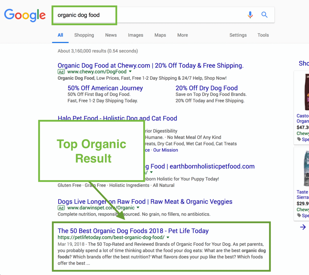 For example, lets say you have a category or product page for organic dog food, you might think that would be a great target keyword?