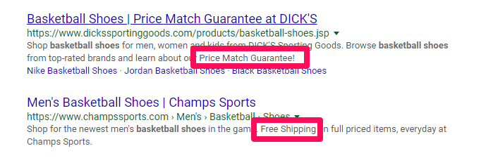 You can also add phrases such as “Free Shipping” or “Price Match Guarantee” to maximize the click-through rate (CTR.)