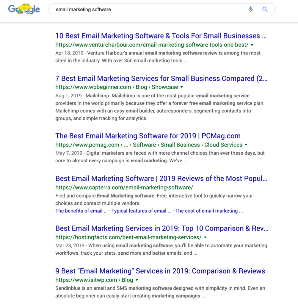 For instance, Google tends to rank more articles over product pages. If you search right now for “best email marketing software,” you might notice that Google is ranking articles about the best marketing software, as opposed to a product page from one of the top brands.