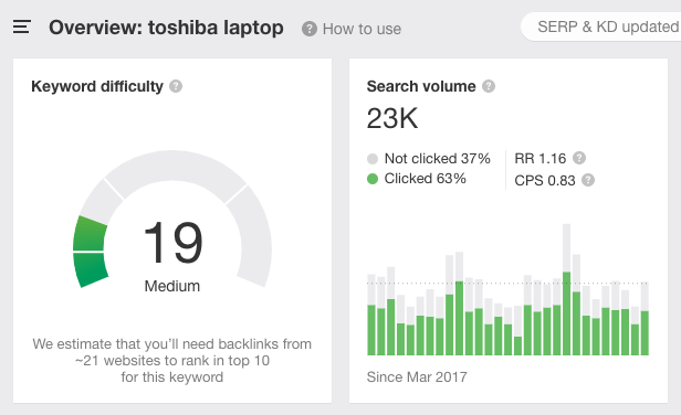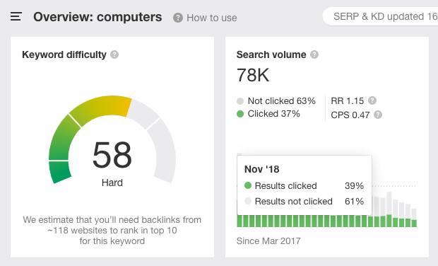 You can see that although the search volume is high, the keyword difficulty is “high” according to this tool from ahrefs.