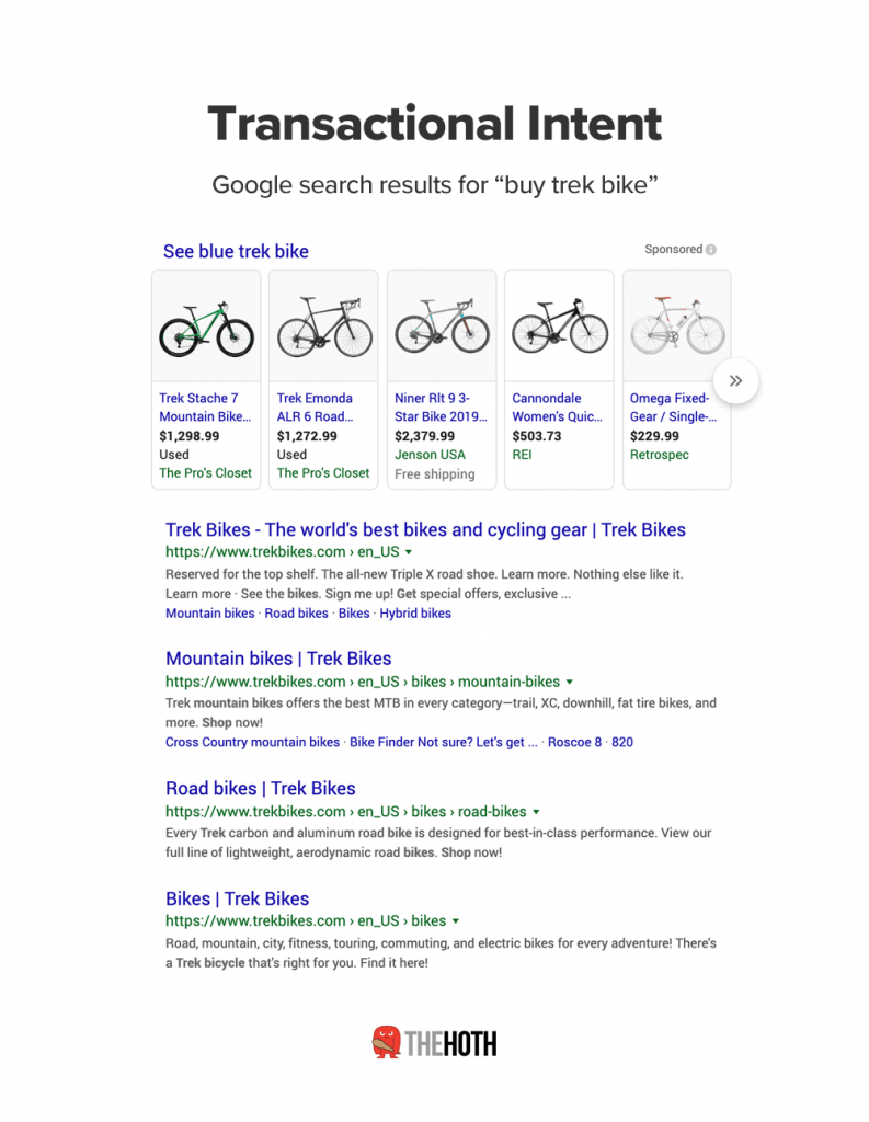 Let me break this down, let’s say for example, if someone searches for “buy blue trek bike” they are likely looking to purchase. The search results will often display product pages because this search is so specific.