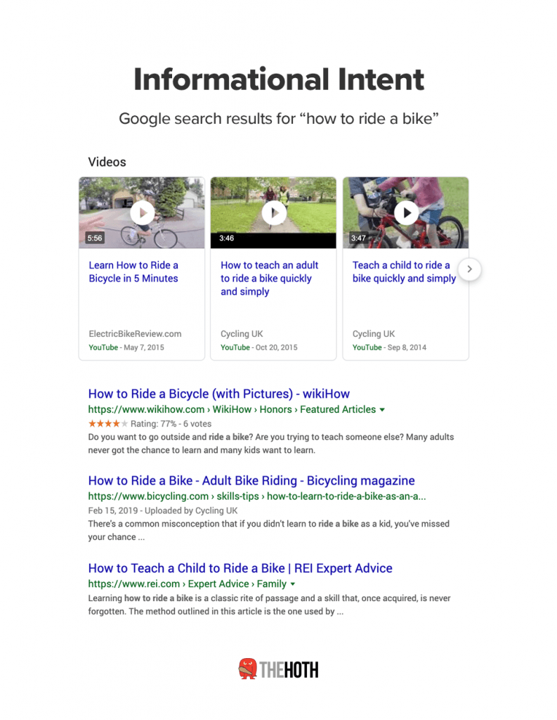 For example, if someone searched “how to ride a bike” they are looking for a guide. The search results will display articles or videos about how to ride a bike.