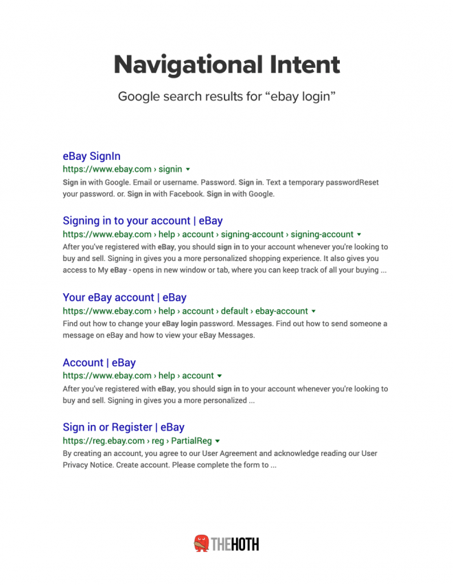 Another example would be, searchers might type “eBay login” into the search engines when they want to find the login page to Ebay.com. So, to be clear navigational intent isn’t just a main website, it can be pages off of a website such as a login or product page.