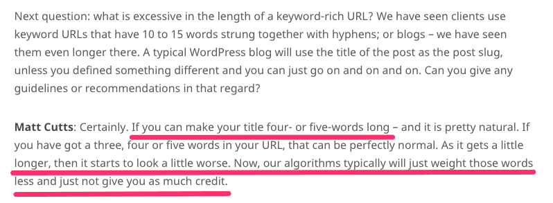 Google’s former head of search quality, Matt Cutts, stated in an interview that it’s important to keep URLs short: