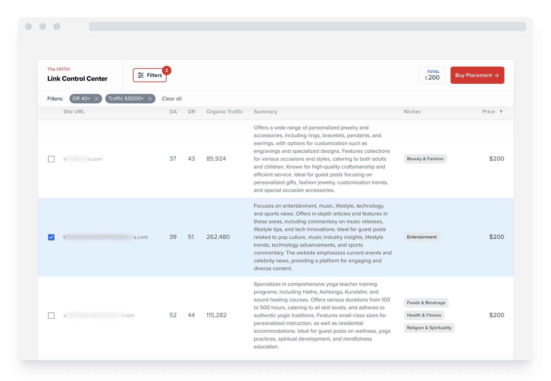 Search and filter by the data that matters most—Domain Authority (DA), Domain Rating (DR), traffic, or niche.